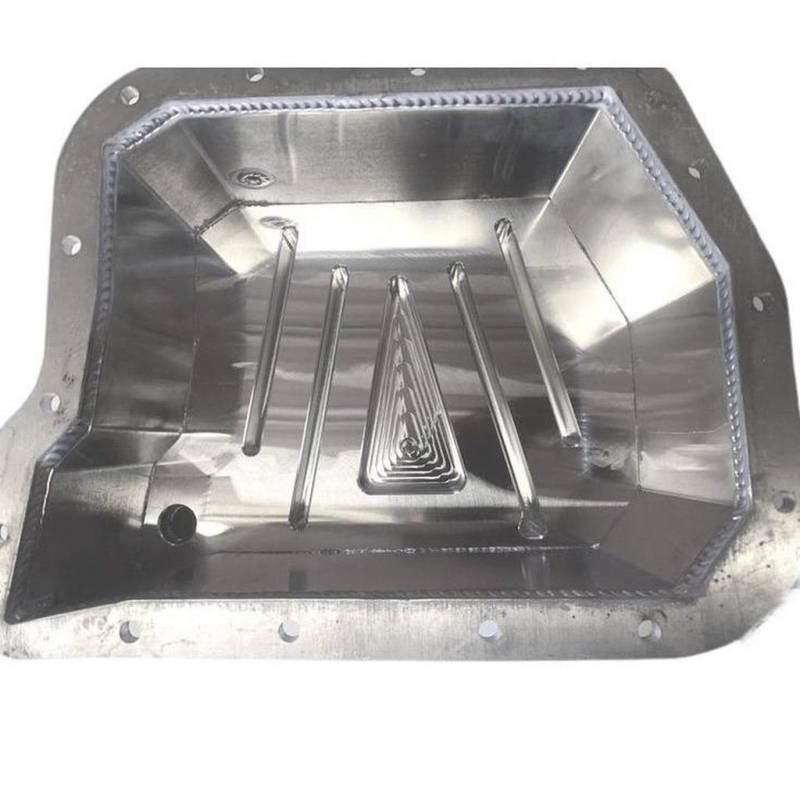 This is FSD's fabricated aluminum temperature control transmission pan. This pan not only looks cool but has a few functions that set it apart. For years customers have been struggling with the factory heat exchangers on their trucks failing and causing transmission fluid and coolant to mix. In return it destroys their transmission.