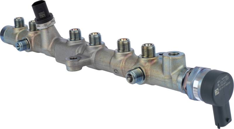 Genuine Bosch Fuel Injection Rail Assy - Dual Port for 2019-2024 Ram 6.7L Cummins Diesel Engine. Direct Replacement for Dodge / Ram part 68447760AA. Part includes Fuel pressure sensor 0281006928 and fuel pressure regulator 0281006250.