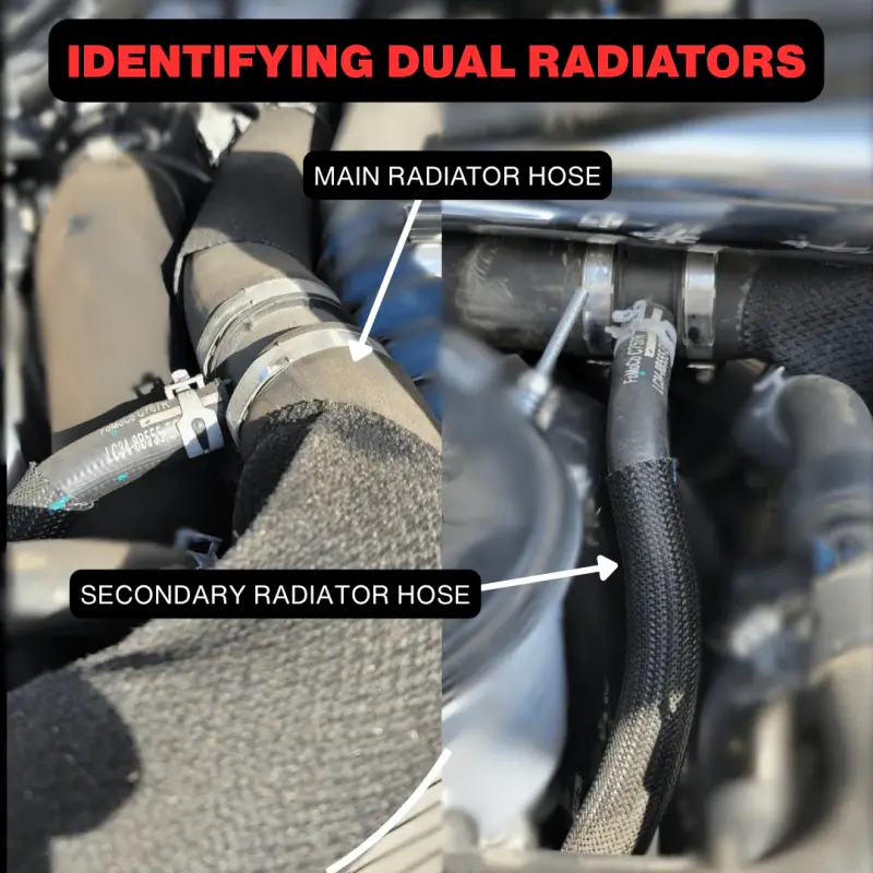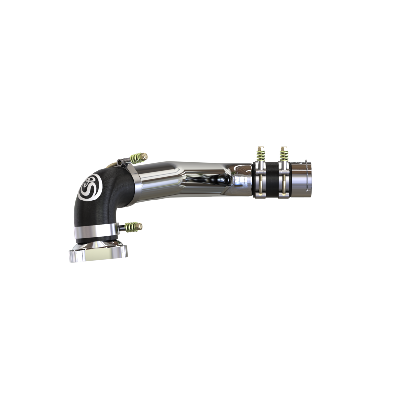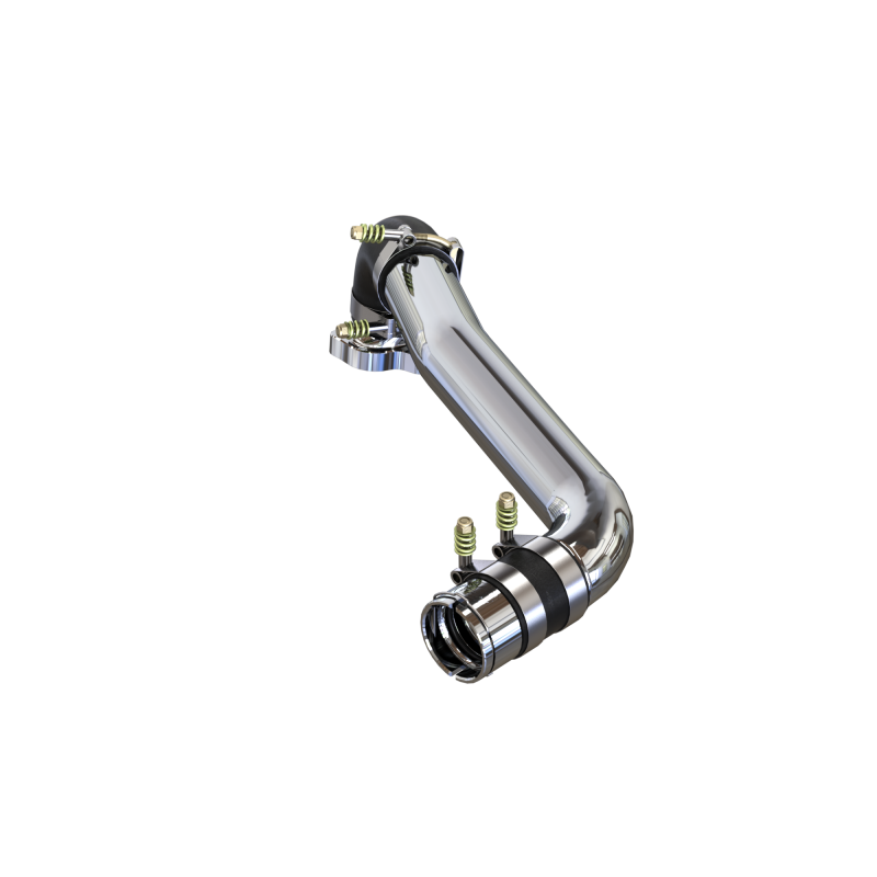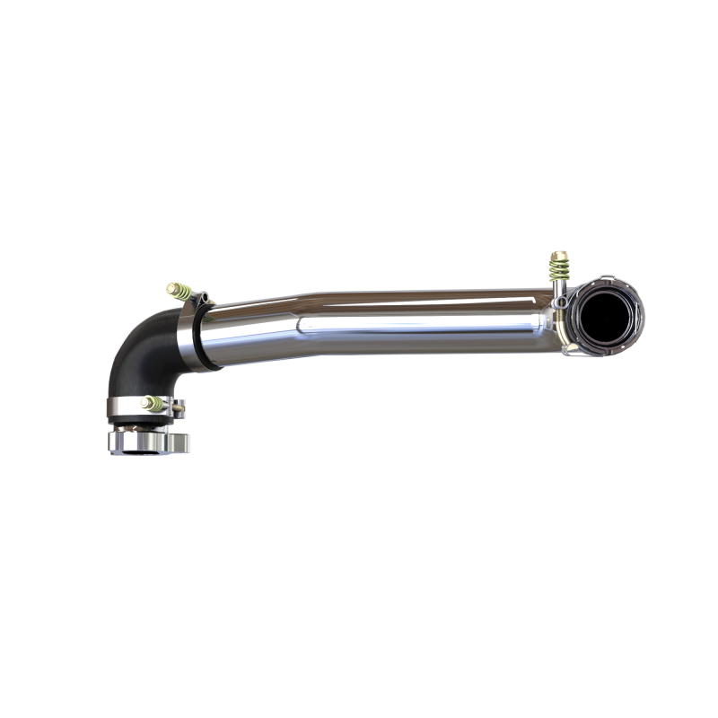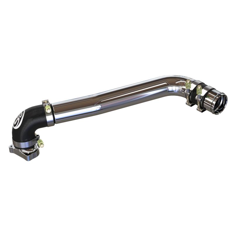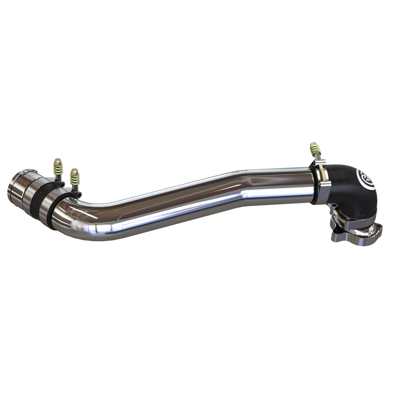 The aluminum S&B Upper Coolant Pipe (radiator pipe) for the Ford Powerstroke 6.7L features billet ends, silicone couplers, mandrel bent pipe, and connects with stainless steel hose clamps with a sealing liner. These are significant improvements over the factory plastic pipe, which is prone to cracking, leaking and failure.