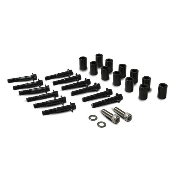 High-strength exhaust manifold bolt and spacer kit with manifold gaskets for 1998.5-2018 Dodge Ram with 5.9L/6.7L Cummins engines. Features Grade 10.9 chromoly steel bolts with black oxide finish and spacers to prevent heat-related failures and exhaust leaks.