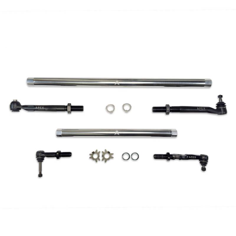A direct replacement extreme duty Tie Rod and Drag Link assembly to replace your underperforming OE steering. Oversized tie rod and drag link ends, connected by massive Polished Aluminum adjusting sleeves, eliminates death wobble and tightens up steering under the most extreme conditions. Weak adjusting sleeves are replaced via tie rod and drag link ends threading directly into the connecting rods, secured by jam nuts and our proprietary ninja lock-washers and our New ProLock washers.