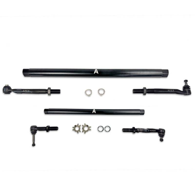 A direct replacement extreme duty Tie Rod and Drag Link assembly to replace your underperforming OE steering. Oversized tie rod and drag link ends, connected by massive DOM Steel adjusting sleeves, eliminates death wobble and tightens up steering under the most extreme conditions. Weak adjusting sleeves are replaced via tie rod and drag link ends threading directly into the connecting rods, secured by jam nuts and our proprietary ninja lock-washers and our New ProLock washers.